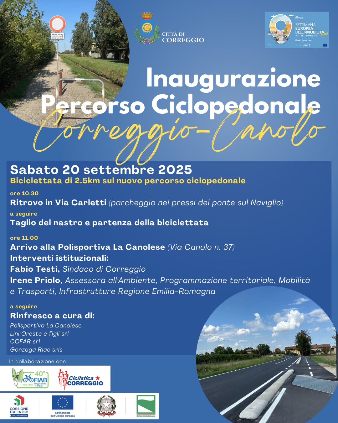 Sabato 20 settembre 2025 si inaugura il nuovo percorso ciclopedonale Correggio - Canolo: un collegamento sicuro pensato per chi sceglie di muoversi a piedi o in bicicletta.