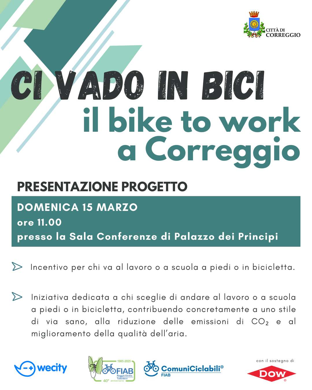 Il Comune di Correggio promuove il progetto CI VADO IN BICI – IL BIKE TO WORK A CORREGGIO, un’iniziativa dedicata a chi sceglie di andare al lavoro o a scuola a piedi o in bicicletta, contribuendo concretamente alla riduzione delle emissioni di CO₂ e al miglioramento della qualità dell’aria.